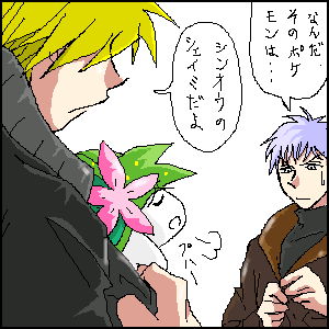 突然、ブソンの懐から見慣れないポケモンが顔を出しました。驚いたホムラが尋ねると、返ってきた名前は「シェイミ」。