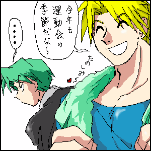 いつものメンバーの中では、ブソンと一番身長の近いのがコサブロウ。そのため、二人三脚に引っ張り出されるハメになる。
