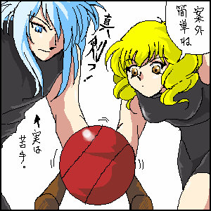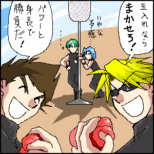 思いきり上へ投げたつもりの玉が、手をすっぽ抜けて水平にタツミにヒット。力まかせだったために、玉の当たり方も音も痛々しいほど派手である。