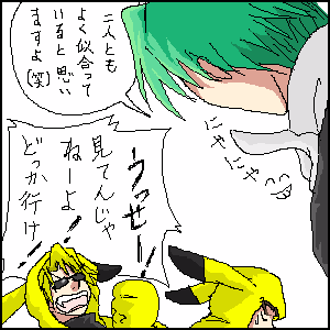 喜々とした黒い笑顔のバショウが、女装の仇と言わんばかりの目で二人を見る。